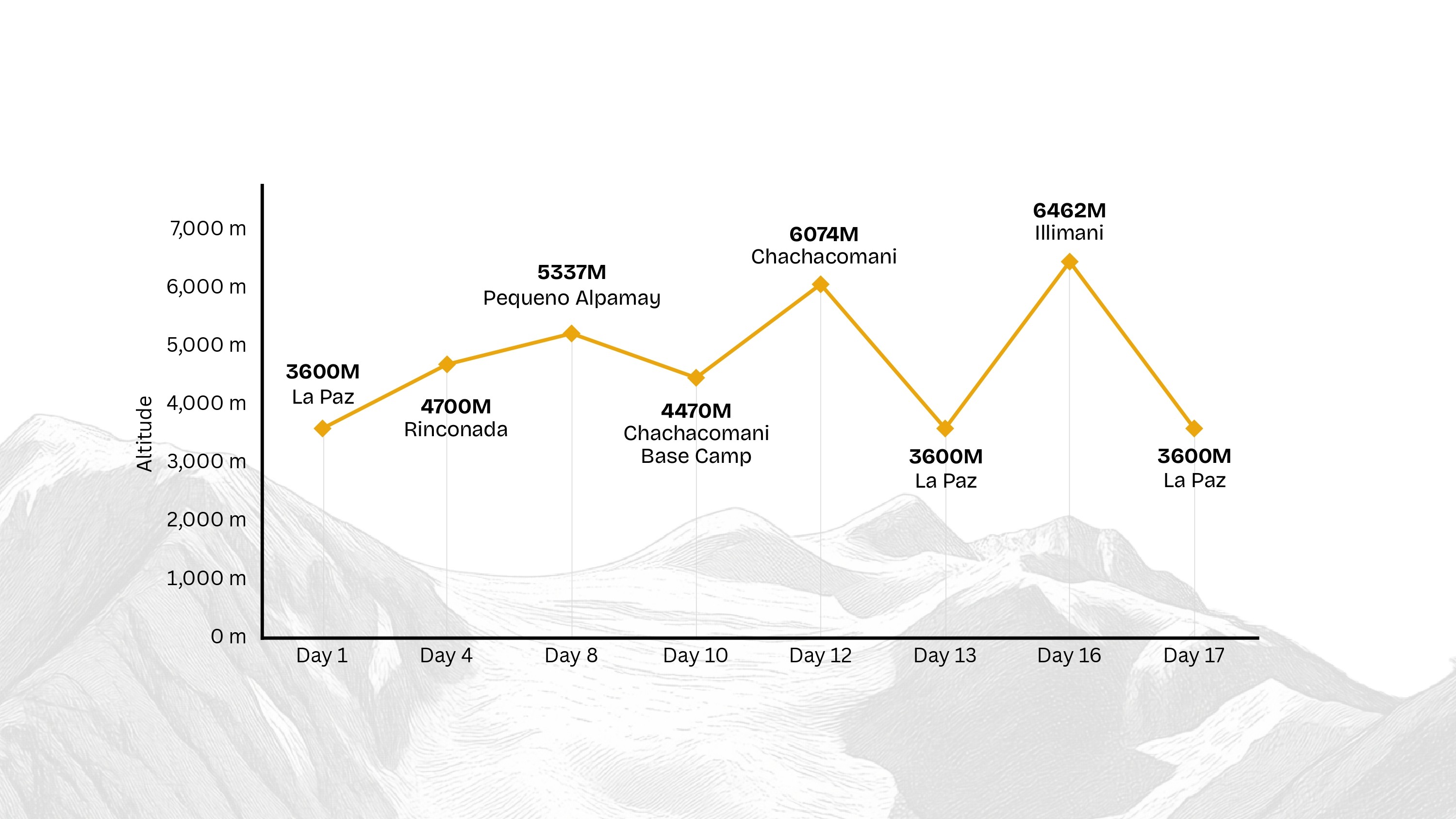 After returning to La Paz for rest, the expedition continues with a three-day ascent of Chachacomani (6074 m). Afterwards we will also attempt Illimani (6462m), a dominant peak overlooking La Paz and a fitting finale. Bolivia is known for its consistently stable weather, which has historically allowed full completion of the climbing program.